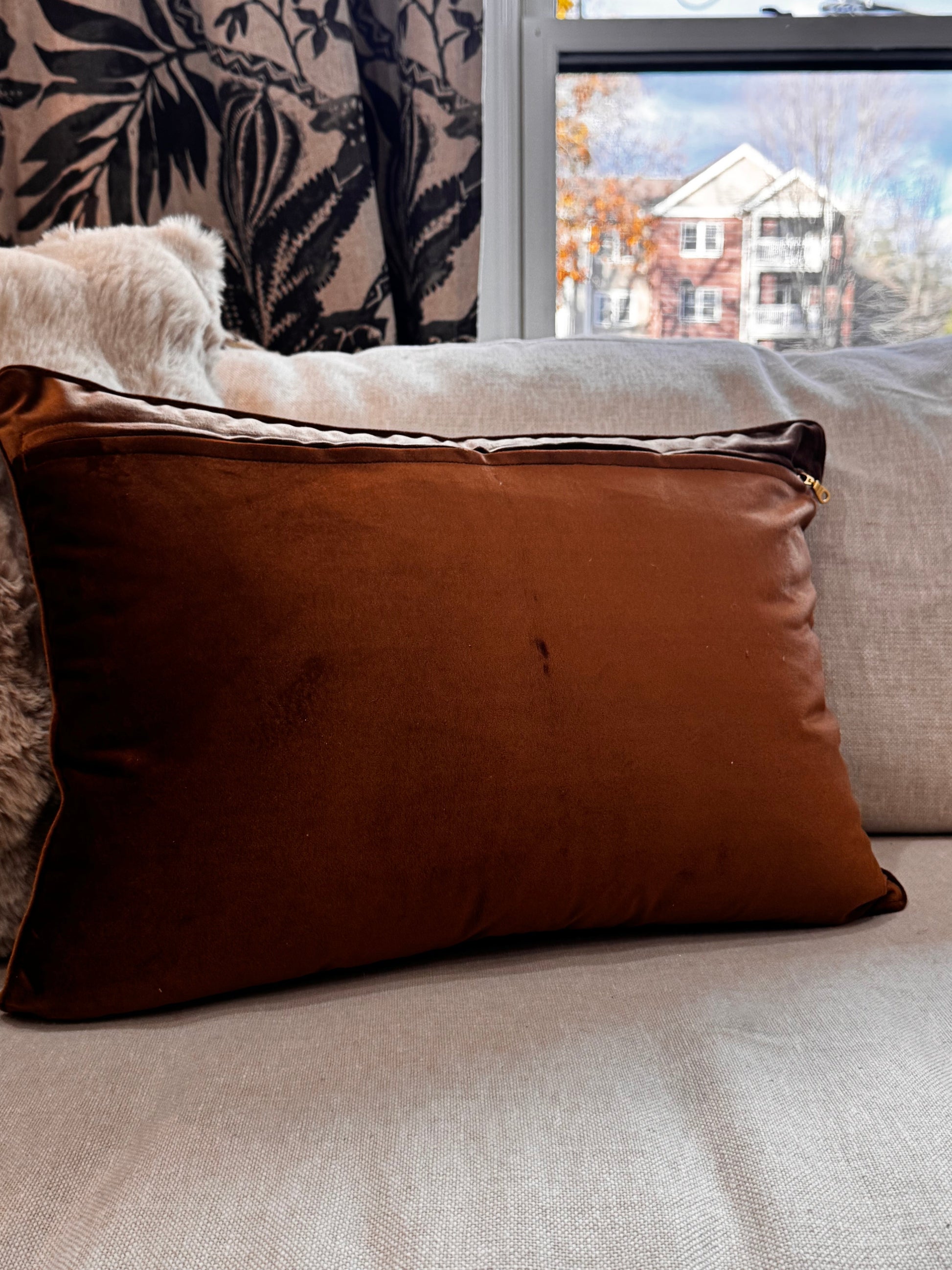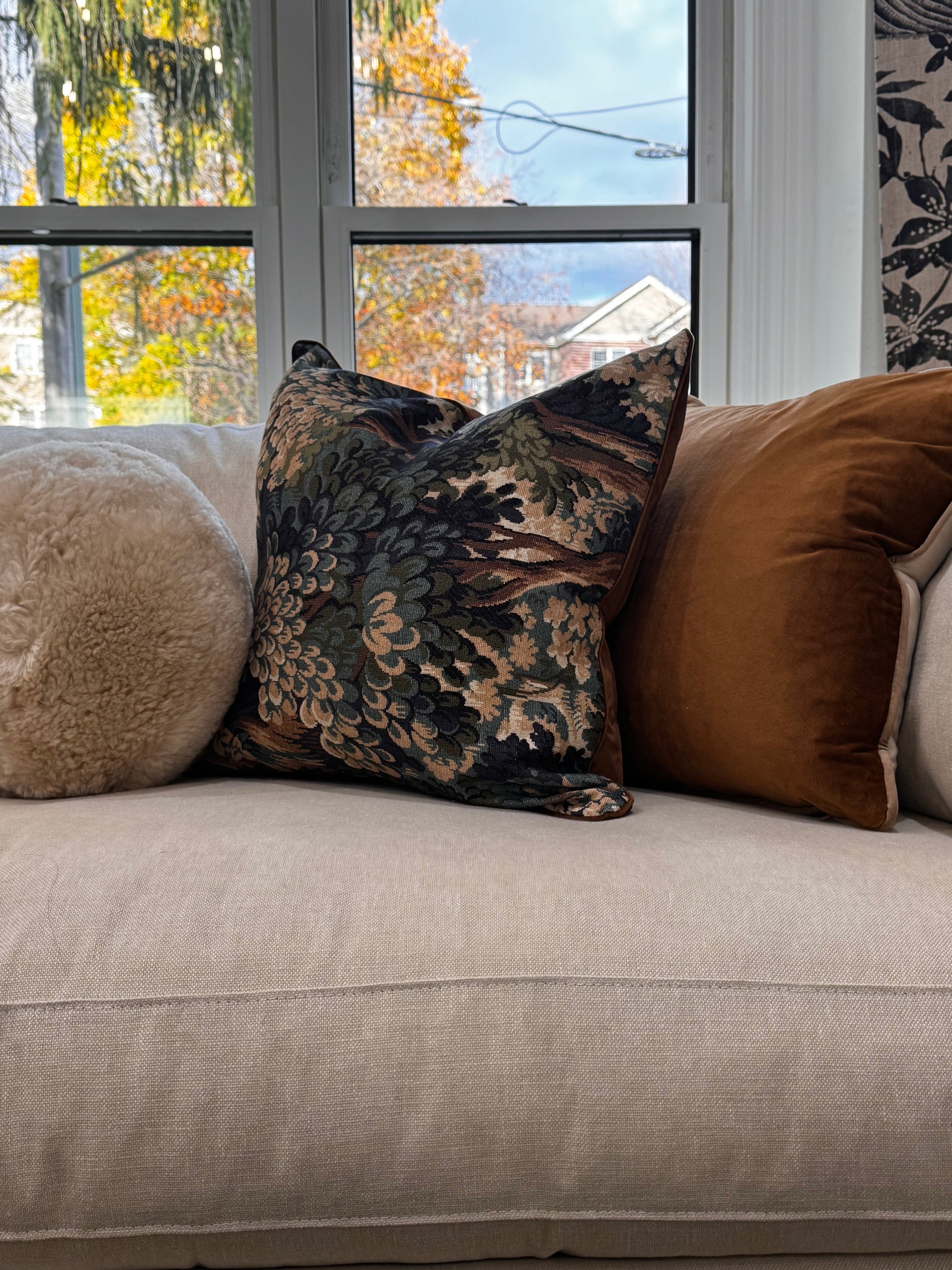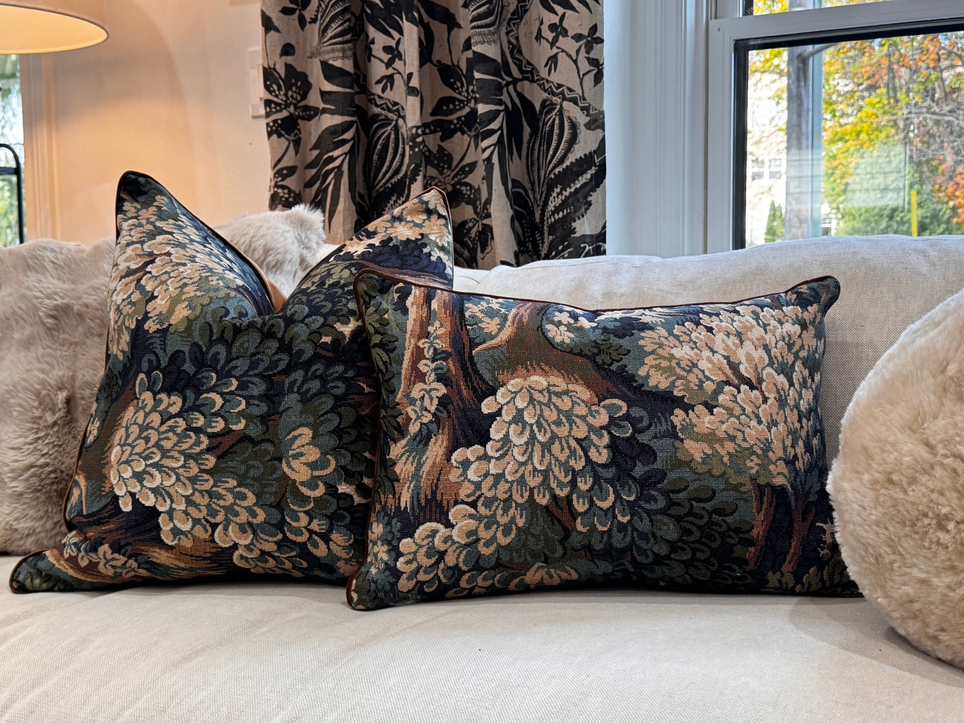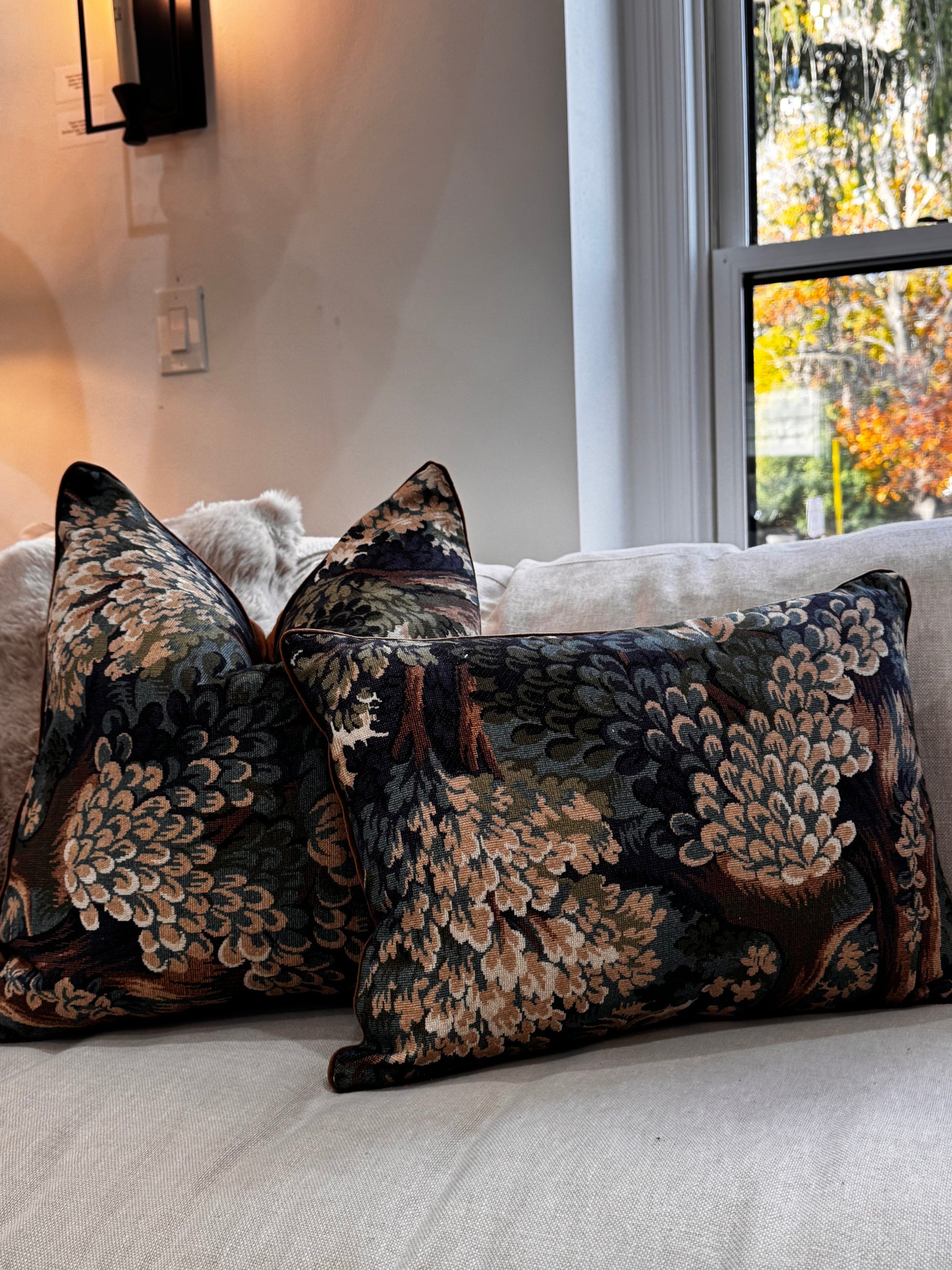The Amelia Pillow forest tapestry a luxurious velvety backing and elegant piping, providing a sophisticated and comfortable addition to your home decor.